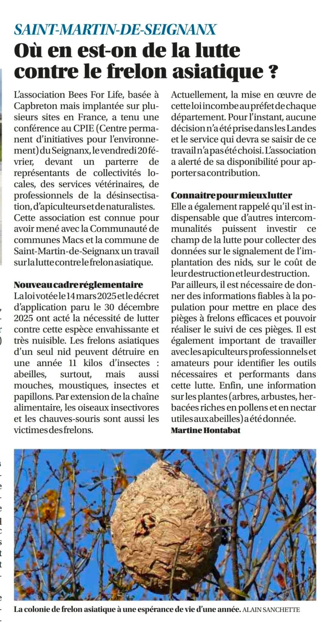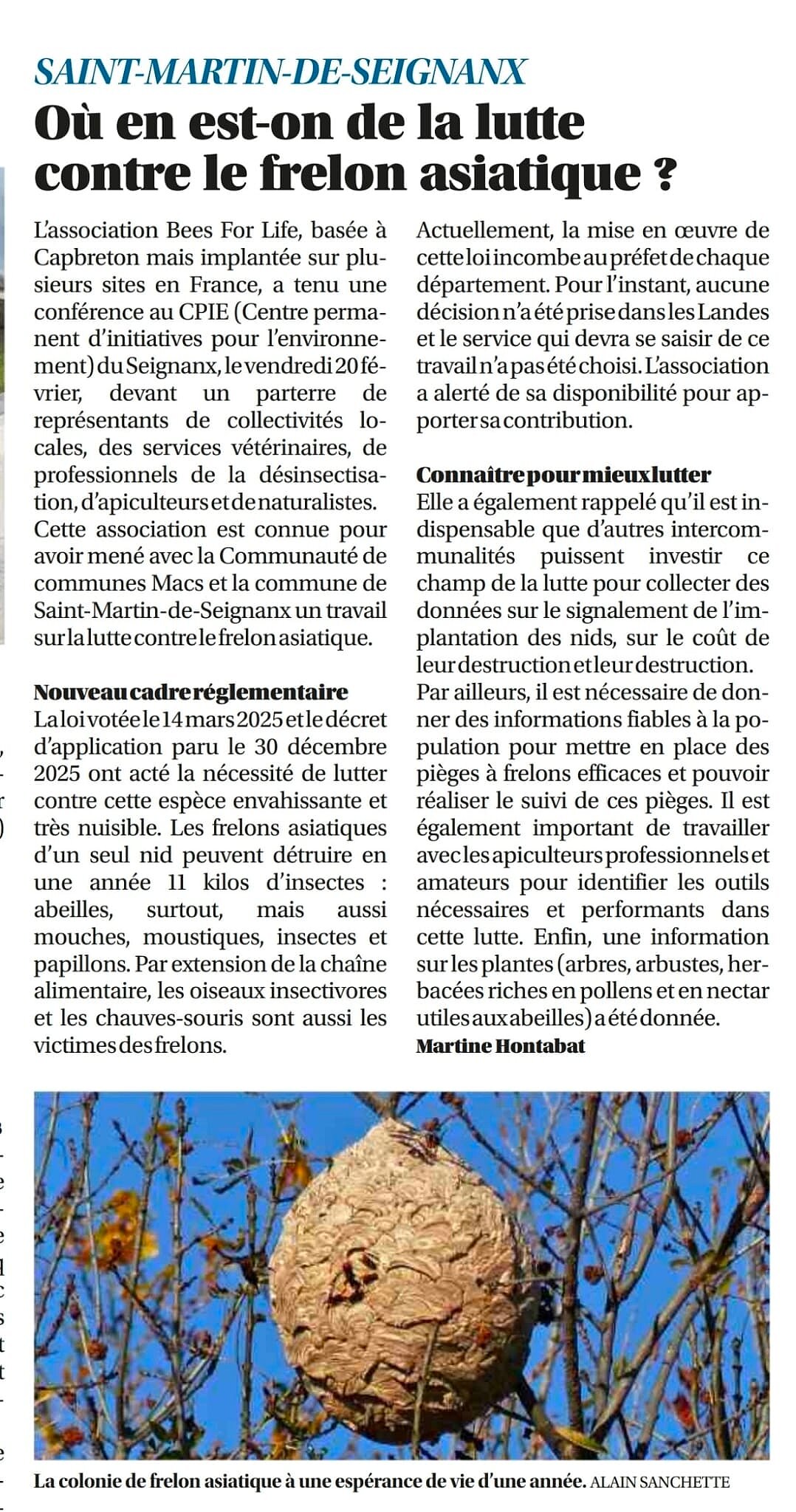 BeesForLife est connu pour mener avec la Communauté de communes Macs et la commune de Saint-Martin-de-Seignanx un travail sur la lutte contre le frelon asiatique.Les 23 communes de la collectivité sont équipées des plateformes spécifiques de BeesForLife ( voir sur le site BeesForLife.fr les collectivité et associations adhérentes )